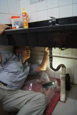 “我們服務(wù)搞得好一點(diǎn),租戶就租得時(shí)間長一點(diǎn),集團(tuán)的利益就能多保障一點(diǎn)?!?br />        7月6日下午2時(shí),在順河街一處網(wǎng)點(diǎn)房的洗手間里,54歲的唐建民斜倚在地上,費(fèi)力地將頭伸入洗手盆的下面,維修壞掉的下水管道。當(dāng)天,室內(nèi)溫度大約在35攝氏度左右,狹小無窗的洗手間溫度更高。在手機(jī)手電筒微弱的光線下,唐建民認(rèn)真地工作著,難聞的味道與難耐的高溫仿佛對(duì)他沒有影響——如果忽略不停滴落的汗水的話。